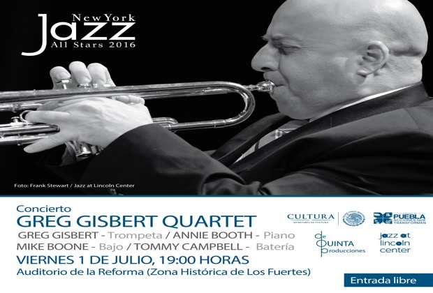 El Consejo Estatal para la Cultura y las Artes de Puebla (CECAP), en colaboración con la Secretaría de Cultura Federal y DeQuinta Producciones, en sociedad con Jazz at Lincoln Center, presentan a Greg Gisbert en Puebla. Considerado como una leyenda del jazz, el destacado trompetista norteamericano ha tocado con importantes figuras del jazz y pop, como Wynton Marsalis, Frank Sinatra, Maria Scheiner, Ella Fitzgerald, David Bowie y Lady Gaga.
