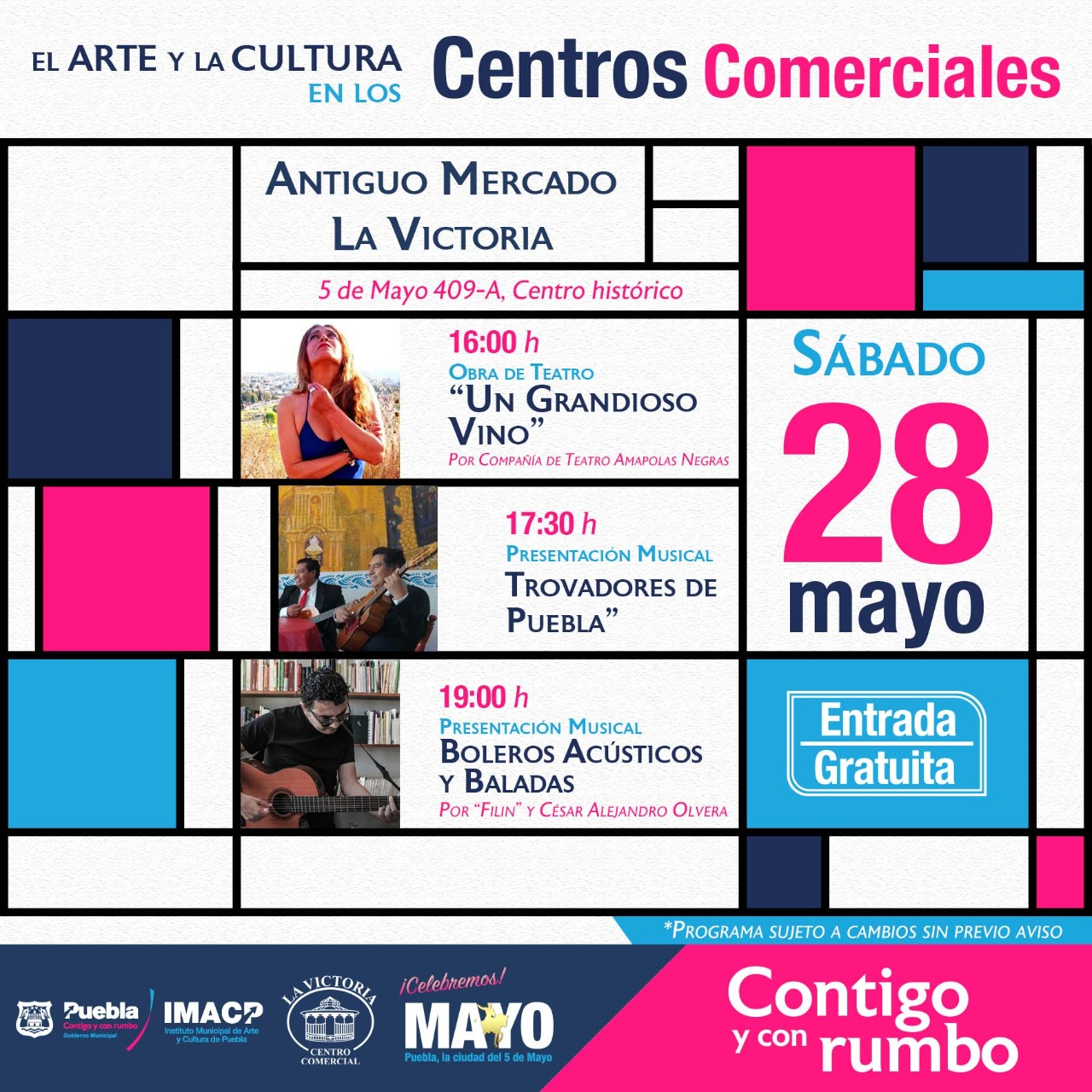 Es así que el Instituto Municipal de Arte y Cultura presenta las actividades de este fin de semana, en Centros Comerciales como Vía San Sebastián, Plaza Dorada, Antiguo Mercado la Victoria y Galerías Serdán se llevarán a cabo presentaciones de Baile de Break Dance, teatro, mariachi, entre otras actividades.