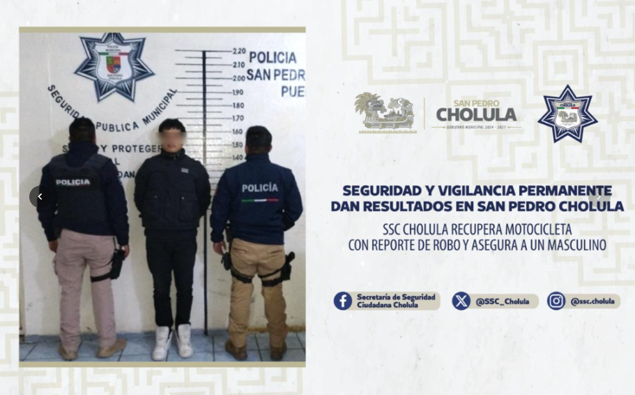 SSC Cholula recupera motocicleta con reporte de robo y asegura a un masculino