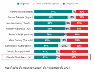La encuesta global Morning Consult, antes celebrada por el presidente López Obrador como referente de prestigio internacional, reportó un vuelco significativo en la imagen pública de Claudia Sheinbaum. En doce meses, la mandataria pasó de un sólido 62% de aprobación a 41%, mientras la desaprobación escaló de 29% a 53%. El cambio, registrado entre noviembre de 2024 y noviembre de 2025, movió a la presidenta del segundo al noveno lugar en el ranking mundial.