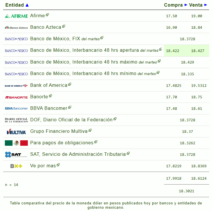 A continuación te brindamos el tipo de cambio dólar a peso hoy en México (USD-MXN), el precio compra y venta en los bancos mexicanos e instituciones de gobierno.
