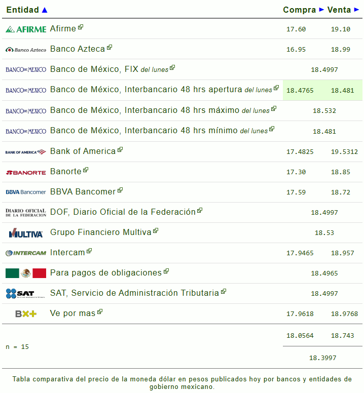 A continuación te brindamos el tipo de cambio dólar a peso hoy en México (USD-MXN), el precio compra y venta en los bancos mexicanos e instituciones de gobierno.