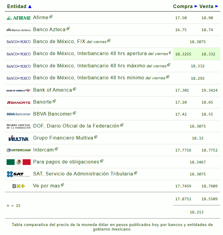 A continuación te brindamos el tipo de cambio dólar a peso hoy en México (USD-MXN), el precio compra y venta en los bancos mexicanos e instituciones de gobierno.