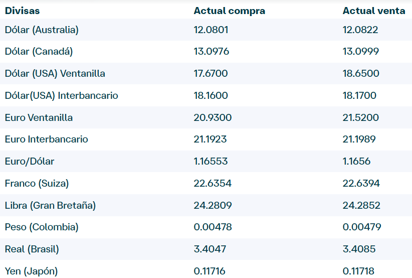 USD Compra: 17.55 Venta: 18.69 EUR Compra: 20.5 Venta: 22.4 CAD Compra: 11.1 Venta: 13.49 OLP Compra: 1065.0 Venta: 1165.0El tipo de cambio es informativo y sujeto a cambios en sucursal.
