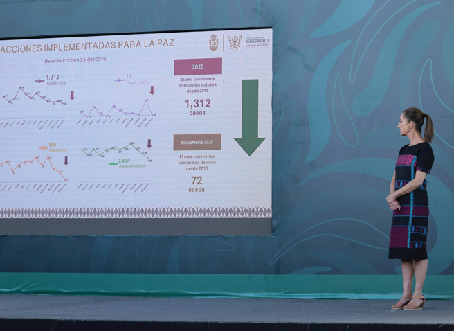 Acapulco, Guerrero, 9 de enero de 2026.- La Presidenta de México, Claudia Sheinbaum Pardo, destacó que en Guerrero se redujeron 65 por ciento el promedio diario de víctimas de homicidios dolosos por mes, de octubre de 2024 a diciembre de 2025, al pasar de 6.58 a 2.32 víctimas, mientras que en Acapulco este delito presentó una reducción del 71 por ciento al pasar de 2.32 a 0.68, es decir menos de un homicidio diario.