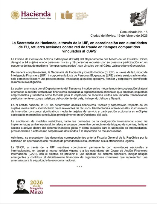 En paralelo, la Secretaría de Hacienda y Crédito Público (SHCP), por conducto de la Unidad de Inteligencia Financiera (UIF), incorporó a siete sujetos adicionales —seis personas físicas y una moral— en la Lista de Personas Bloqueadas (LPB), al identificarlos dentro del núcleo operativo, familiar y corporativo investigado.