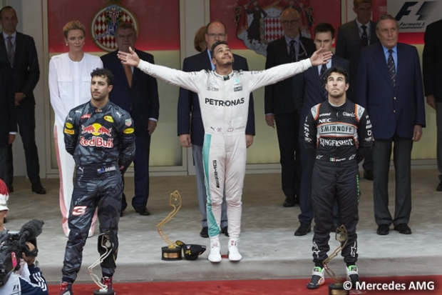 Además, el finlandés Kimi Raikkonen (Ferrari) consiguió terminar segundo, mientras que el mexicano Sergio Pérez (Force India), a pesar de tener que cumplir una sanción de cinco segundos, completó el podio en tercera posición. Vettel, por su parte, fue cuarto.
