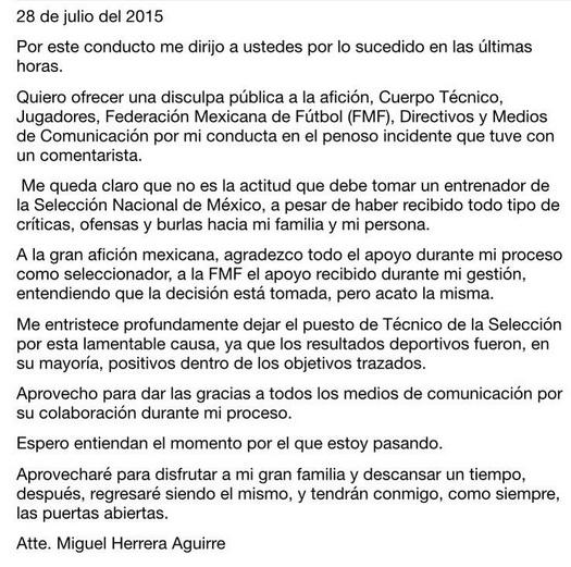 En el texto, el "Piojo" expresó su tristeza por dejar el cargo, pese a que los resultados le acompañaron, clasificando y jugando el Mundial Brasil 2014 y ganando el certamen de Concacaf, reconociendo además que no tuvo una actitud adecuada al atacar, junto a su hija, a Martinoli.